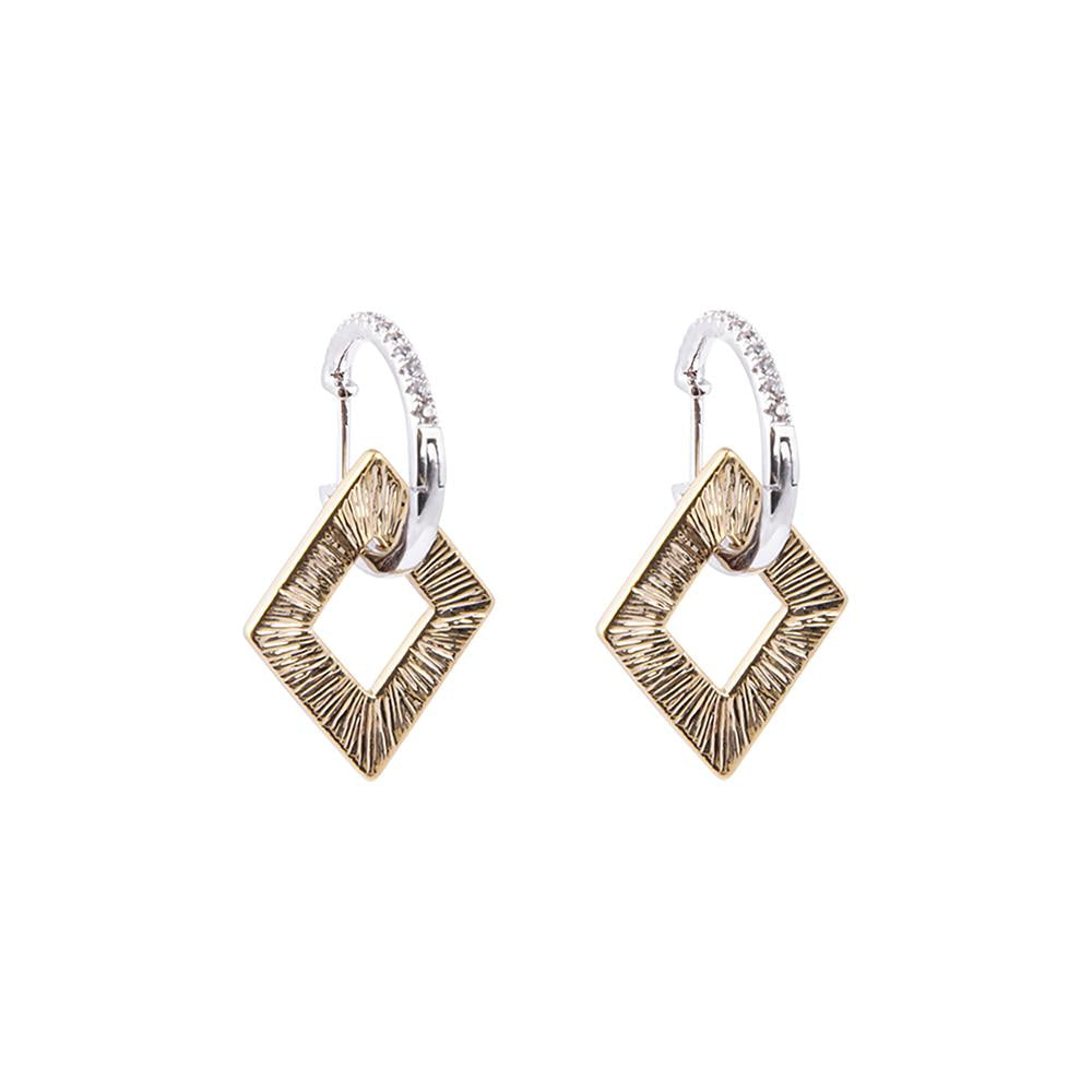 Mixed metal earrings with gold plated drop & rhodium plated crystal encrusted tiny hoop. Clip fastening.