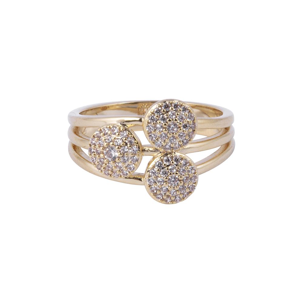 Gold plated ring with 3 circular shapes embellished with CZ stones in micro pavé setting.