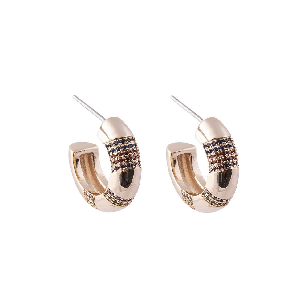 Discreet gold plated hoops encrusted with multi coloured CZ stones in micro pavé setting. Stud fastening.