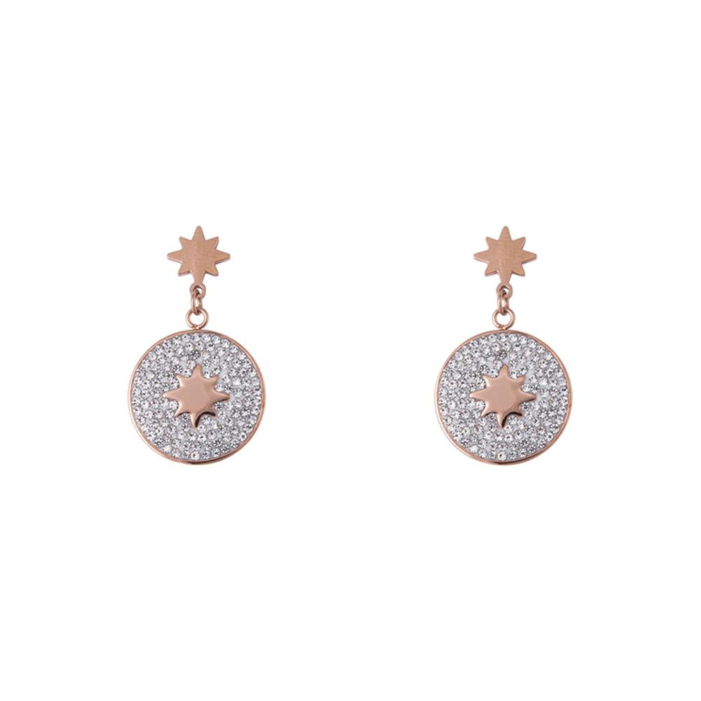 Beautiful disc drop with star shape centre & richly encrusted with crystal. Stud fastening. IP rose gold plating.