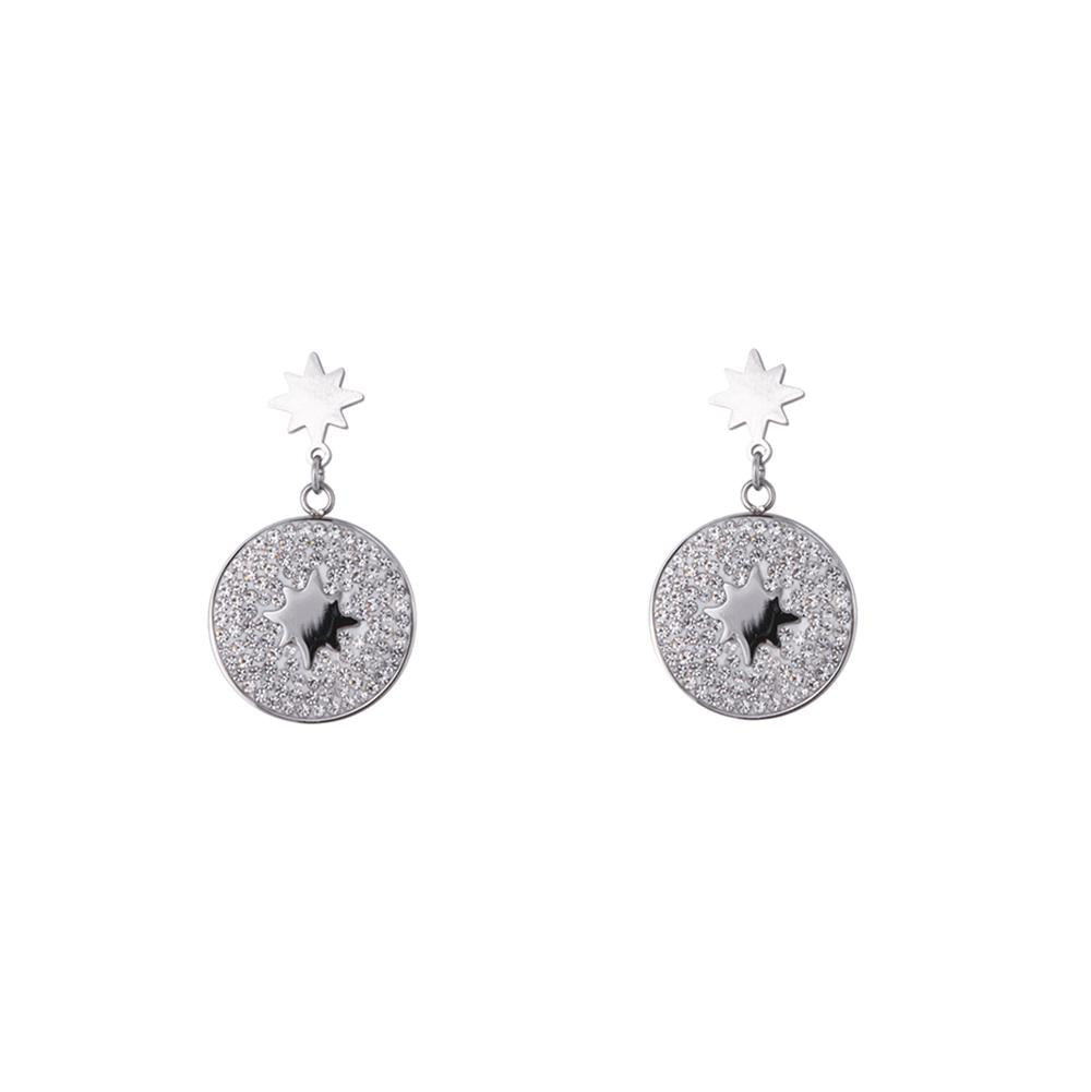 Beautiful disc drop with star shape centre & richly encrusted with crystal. Stud fastening.
