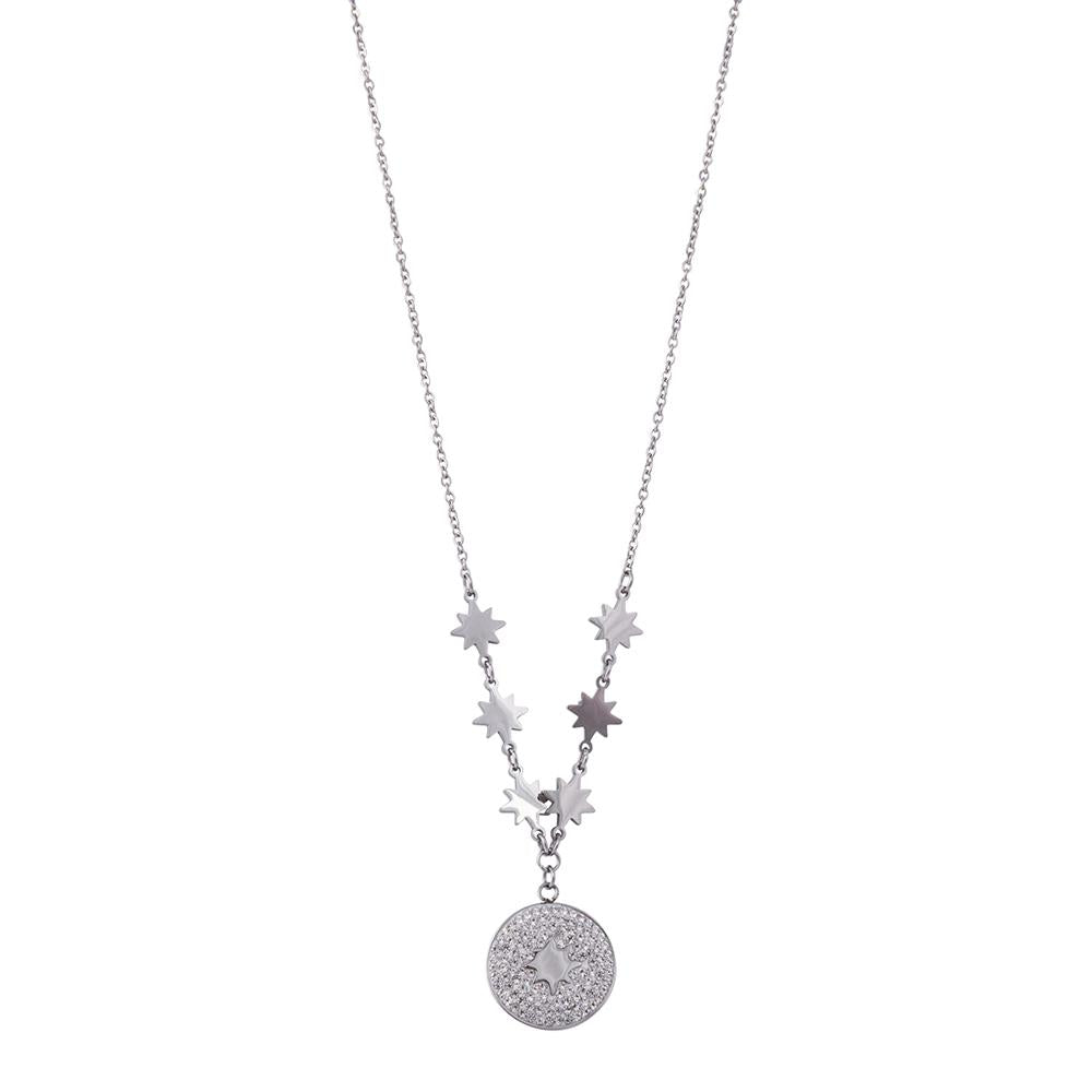 Beautiful disc with starshape centre & richly encrusted with crystals. Fine chain embellished with star charms. Length 40cm + 5cm extension.