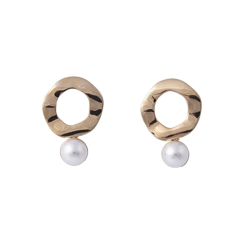 Beautiful hammered style ring shape with faux pearl drop. Gold plating. Stud fastening.