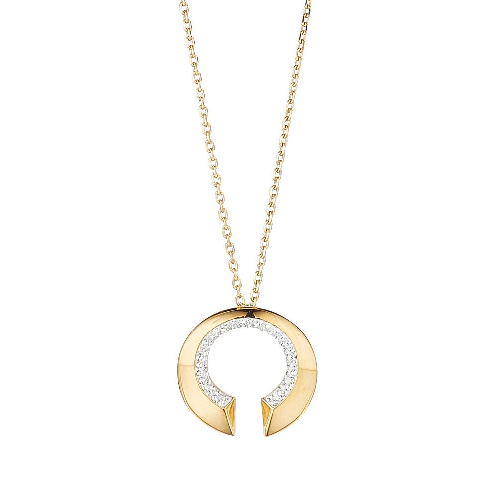 | Beautiful crescent shaped pendant embellished with Preciosa crystal in micro pave setting. Gold plating. Length 40cm + 5cm extension. |