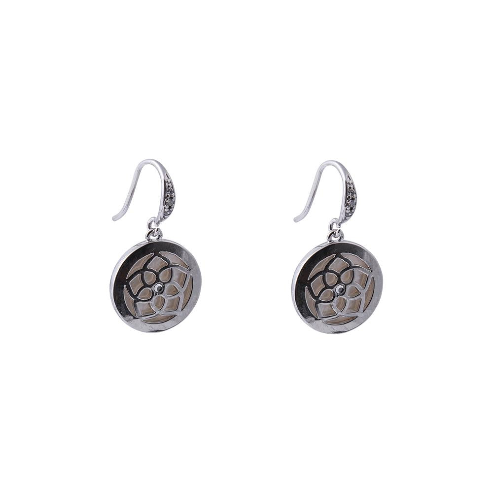 Filigree disc drops with beautiful Mother of Pearl backing. Fish hook fastening. Rhodium plating.