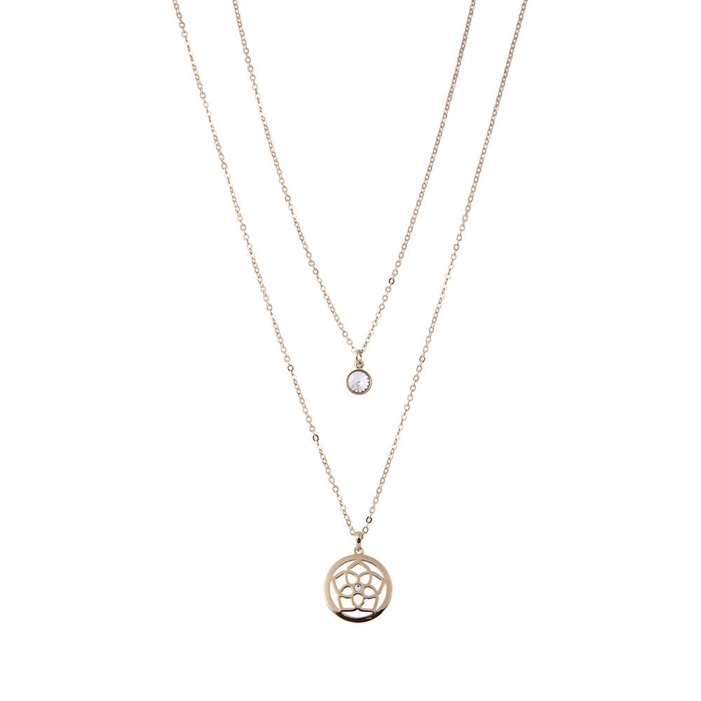 Elegant double layer chain with Swarovski crystal drop and filigree disc with beautiful Mother of Pearl backing. Lengths 15" + 20" + 2" extension. Gold plating.