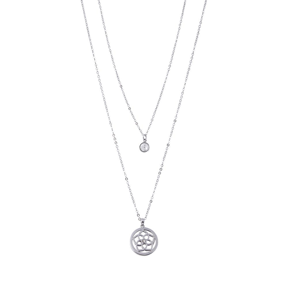 Elegant double layer chain with Swarovski crystal drop and filigree disc with beautiful Mother of Pearl backing. Lengths 15" + 20" + 2" extension. Rhodium plating.