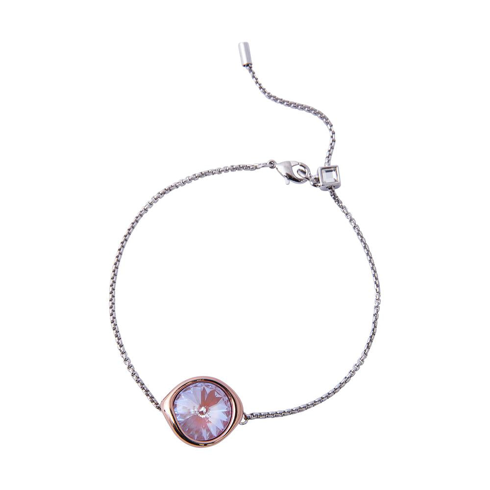Elegant chain bracelet with beautiful Swarovski Lavender Delite stone in distinctive irregular setting in rose gold. Length 8" with lobster claw fastening & slider for length variation.