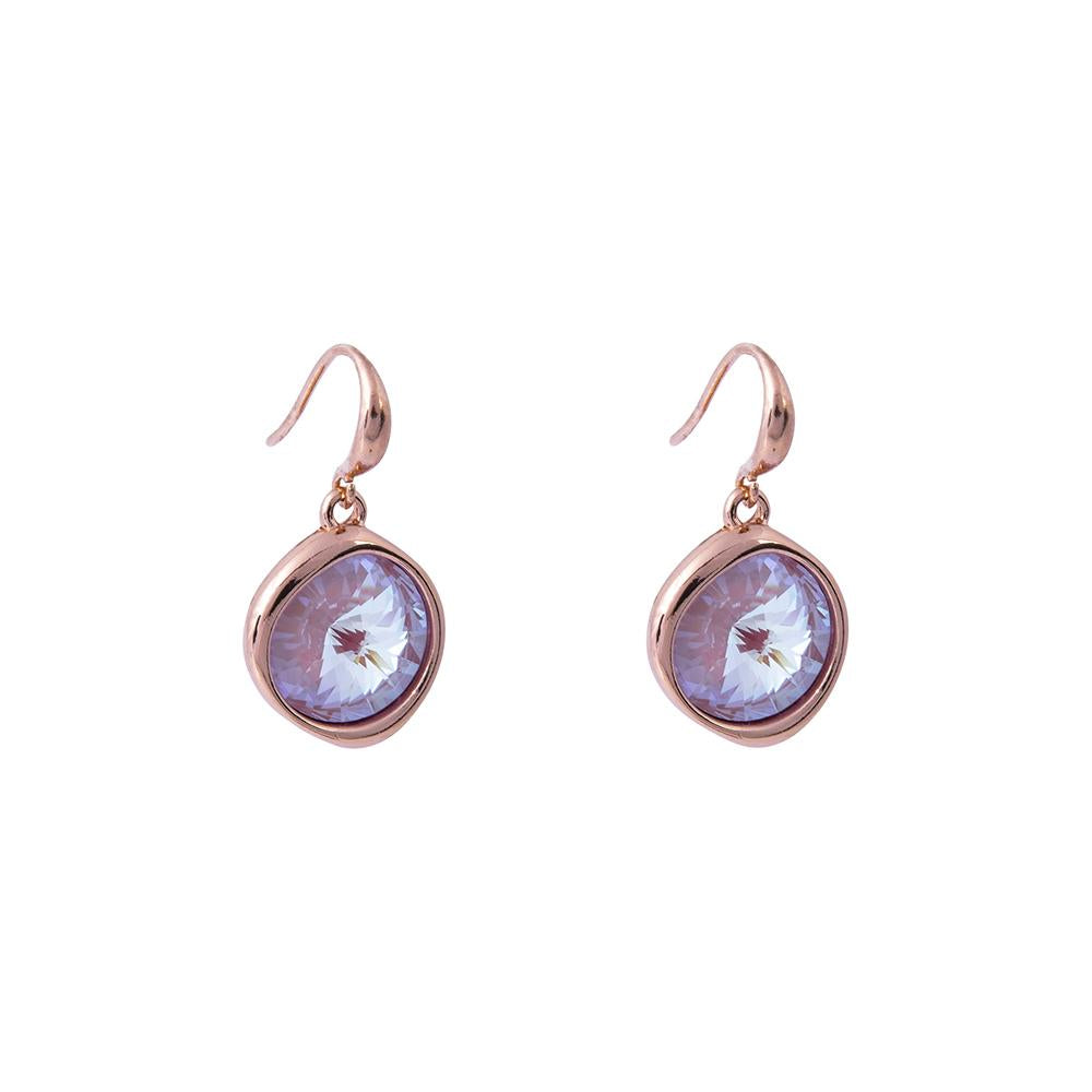 Elegant earrings with beautiful Swarovski Lavender Delite stone in distinctive irregular setting in rose gold. Fish hook fastening.