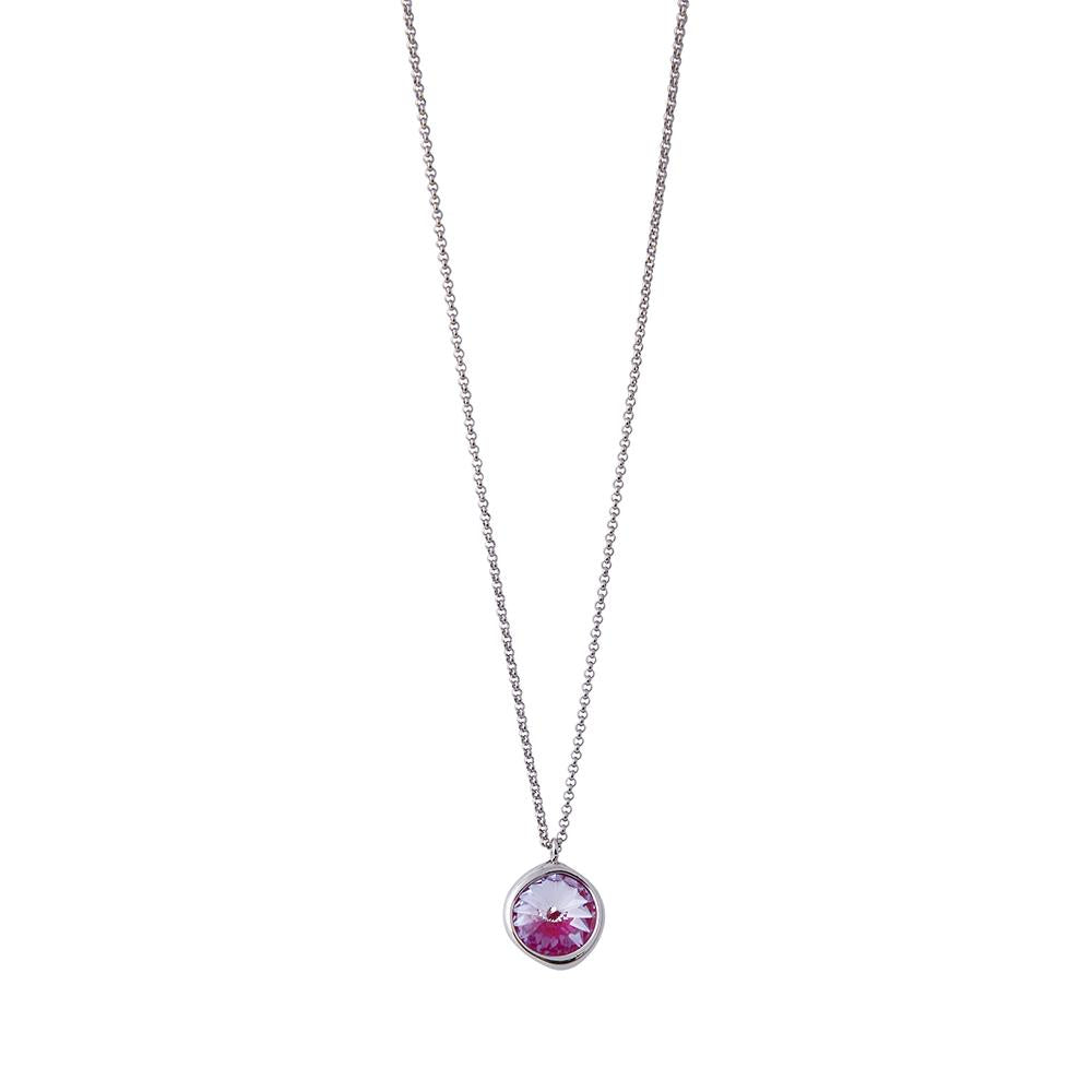 Elegant necklace with beautiful Swarovski Lotus Pink Delite stone in distinctive irregular setting in rhodium. 24" rhodium chain with lobster claw fastening & 2" extension.