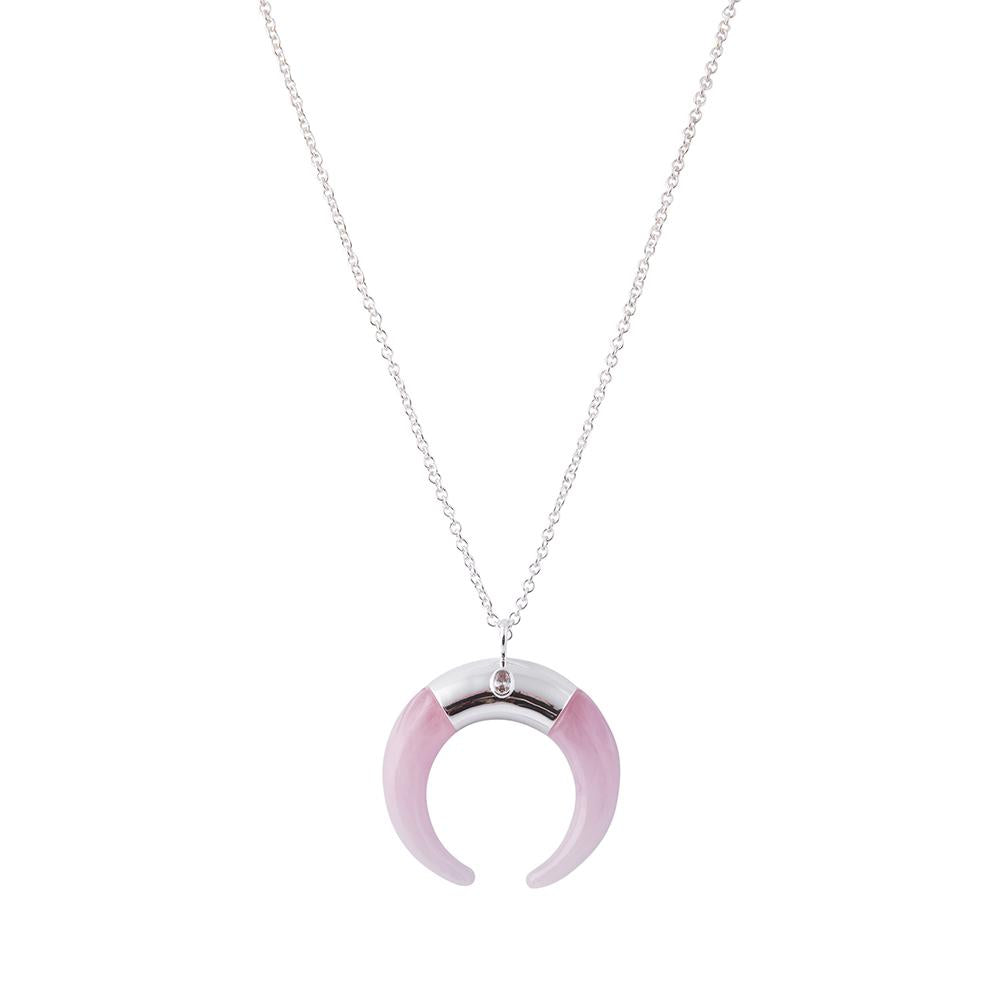 Beautiful crescent shap drop made with pink lucite with marbling effect & embellished with silver plated centre piece. Length 92cm + 5cm extension.