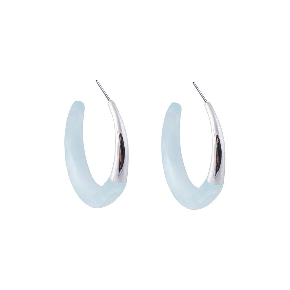 Turquoise lucite hoops with marbling effect trimmed with elegant silver plated tip. Stud fastening.