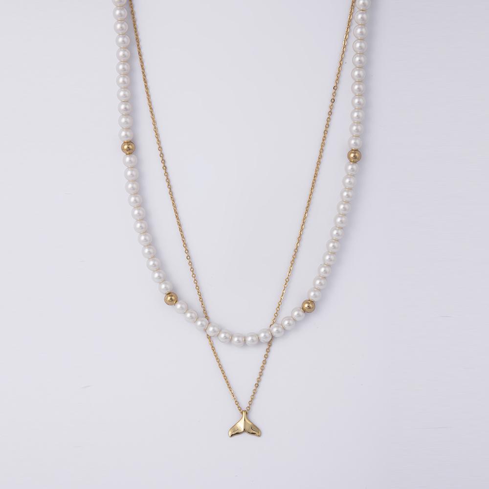 Choker style faux pearl necklace embellished with longer chain & fish tail charm.