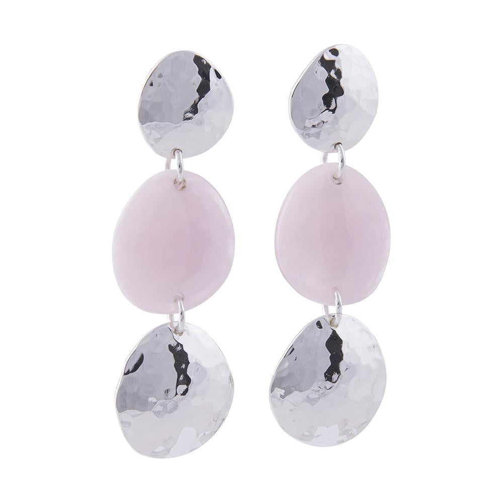 Beautiful drop earring with alternating elements of pink lucite with marbling effect & silver plated brass. Length 5.75cm. Stud fastening.