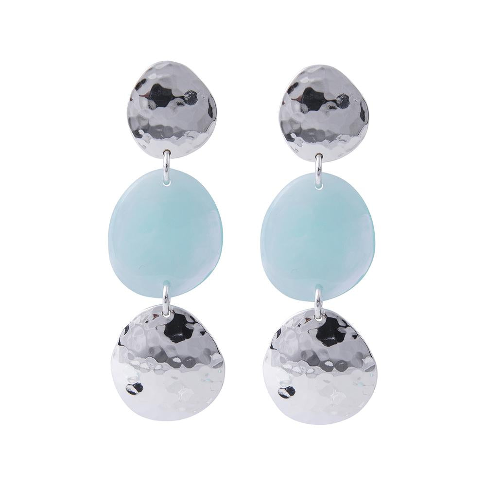Beautiful drop earring with alternating elements of turquoise lucite with marbling effect & silver plated brass. Length 5.75cm. Stud fastening.
