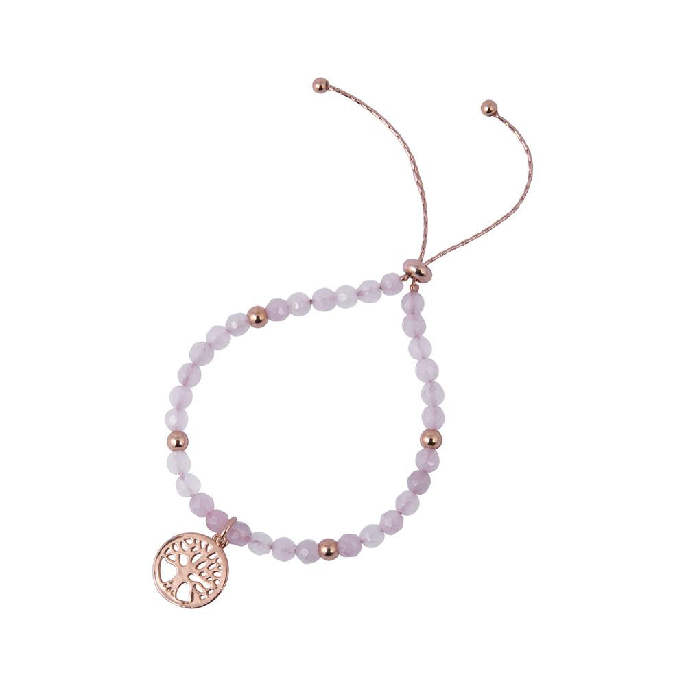 Elegant tree of life bracelet embellished with rose quartz semi precious stones. Slider fastening.