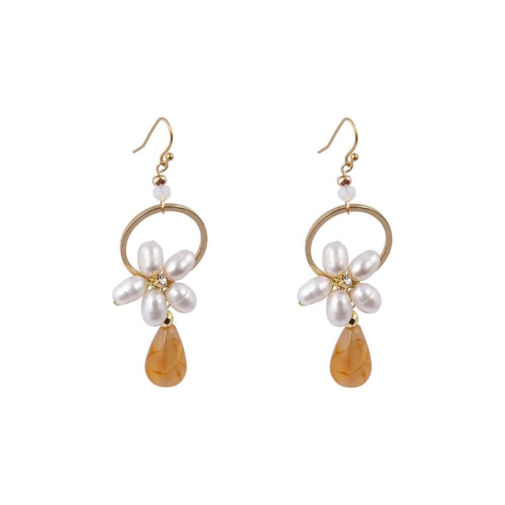 Glamorous fashion earrings with fresh water pearl, semi precious stone & Czech crystal. Length 6.5cm. Fish hook fastening.