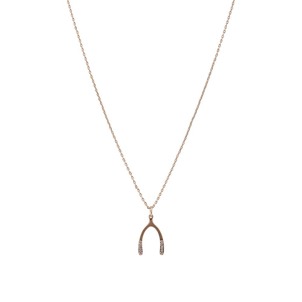 Gold plated necklace with wishbone charm embellished with CZ stones in micro pavé setting. Length 16" + 2" extension.