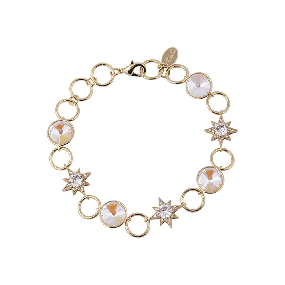 Beautiful bracelet with alternating crystal stars, golden crystal stones & open rings. Gold plating. Lengh 7.5" with lobster claw fastening & 2 ring extension.
